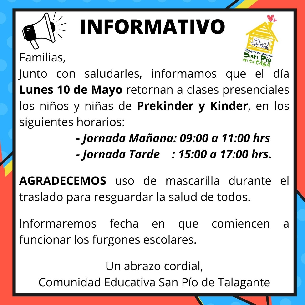 Familias, informamos que los alumnos y alumnas de los niveles Prekinder y Kinder que asistirán de forma PRESENCIAL iniciarán sus clases el día 10 de mayo.